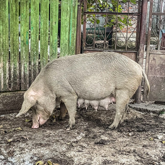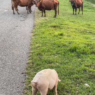 Das hübsche Dorf und (wie überall in Georgien) Strassenkühe und Strassenschweine. Anscheinend wird in Georgien Freilandhaltung tatsächlich noch ernst und wortwörtlich genommen und ausserden mangelnd es wohl an Zäunen. Das Ergebnis: Äußerst selbstbewusstes und angstfreies Nutztier, das verwunderlicherweise selbst stark befahrene Straßen als Tagesverweilort bevorzugt. Vielleicht spazierts sich's da leichter?