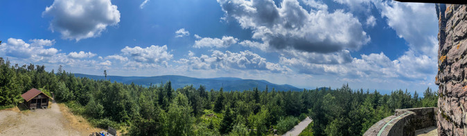 Nachdem die Füße sich erholt haben, führt der Weg am stillen Herrenwieser See vorbei und steigt durch die dunkle Bergflanke des Seekopfs (1.001 m) empor. Mit weiteren 350 Höhenmetern ist der Aufstieg aus dem Murgtal zu den ersten "Tausendern" des Nordschwarzwalds komplett. Die Aussicht vom Gedenkstein für Philipp Bussemer, einem der Gründerväter des Westwegs, ist etwas weniger spektakulär als erhofft. Wenn nicht das ruhige Bänkchen unter den Rhododendren wäre, würde man wahrscheinlich direkt den holprigen Forstweg zum bereits sichtbaren Friedrichsturm auf der Badener Höhe (1.002 m) entlanggehen.